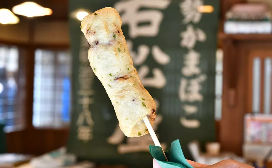 若松屋の顔でもある、まん丸でかわいい『ひりょうず(400円)』は豆腐とすり身のベースに9種類もの具材が入ってボリューム満点。店内に飲食スペースもあるので散策につかれた時、ゆったり座って小腹を満たすのに最適な一品です。