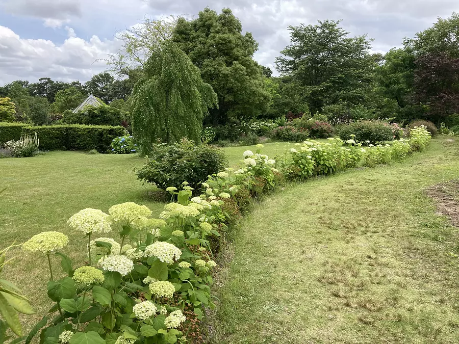 6月はアジサイ、フワフワもふもふの花穂のスモークツリーや、純白からグリーンへの移ろいが美しいアナベル、6月下旬~7月上旬ごろにはバラの二番花をお楽しみいただけます。