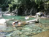 テニスコートほどの大きさの岩など、川遊びの場として大人気。冷たい水に飛び込めば、気分爽快です。