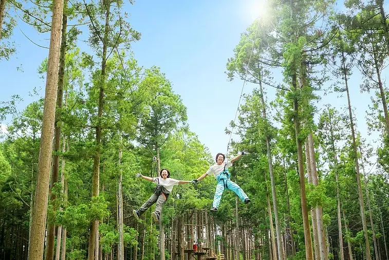 長さ100mを超える”ジップスライド”に、高さ約10mから飛び降りる”ターザンスイング”、そして、フォレストアドベンチャーではココだけ!手をつないでゴールできる"ダブルジップスライド"と42種類のアクティビティがあるので満足すること間違いなし!!