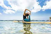SUPボードの上でポーズをとりヨガを行うことで、水のゆらめき、ここちよい風等、自然と一体となる感覚を感じながら、全身の体幹(コアマッスル)を使い、様々なポーズをとっていきます。