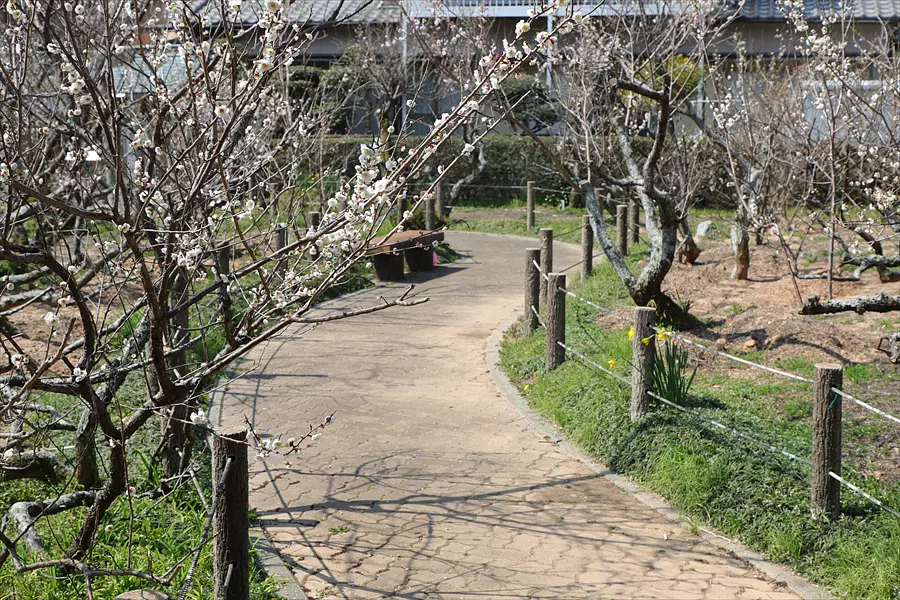夏至梅(白)、萄桃梅(ピンク)、浪花紅梅(赤)、梅園内13本と周辺あわせて30本の梅に樹齢180年の桜の木が花を咲かせます。