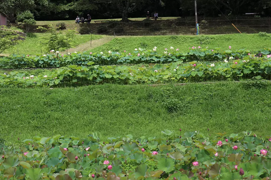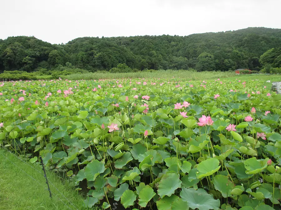 「民話の駅 蘇民」のとなりにある「二見しょうぶロマンの森」園内には、およそ3万株のハスが生育している。