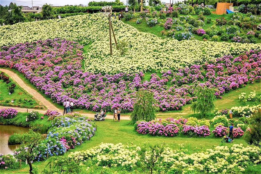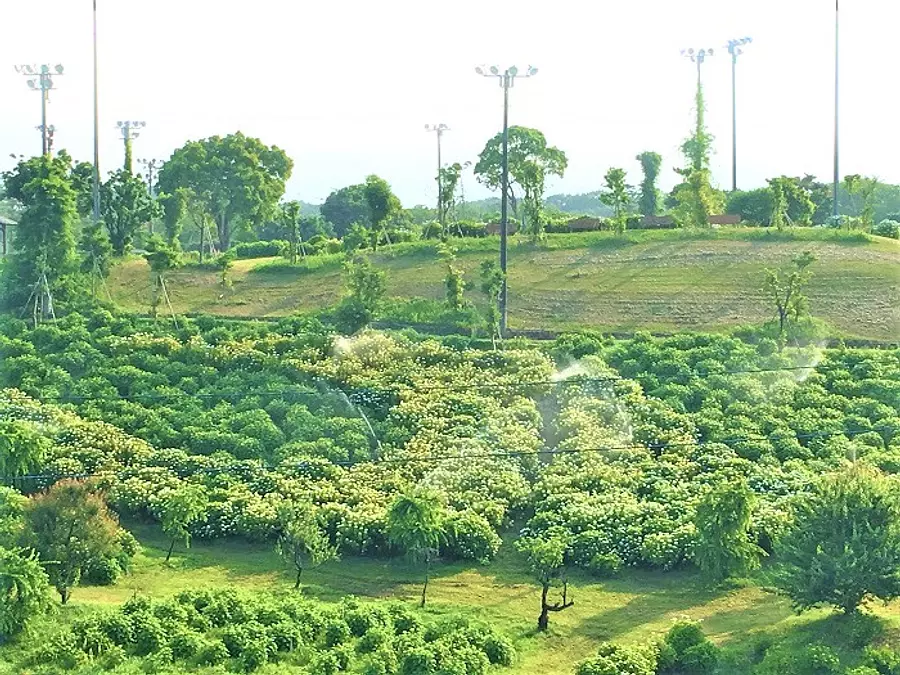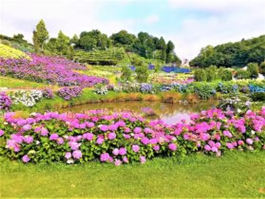 日常生活では見る事の出来ない、あじさいで彩られる「癒しの花景」をお楽しみ下さい。33,000㎡に39品種75,000株のあじさいが植栽されています。