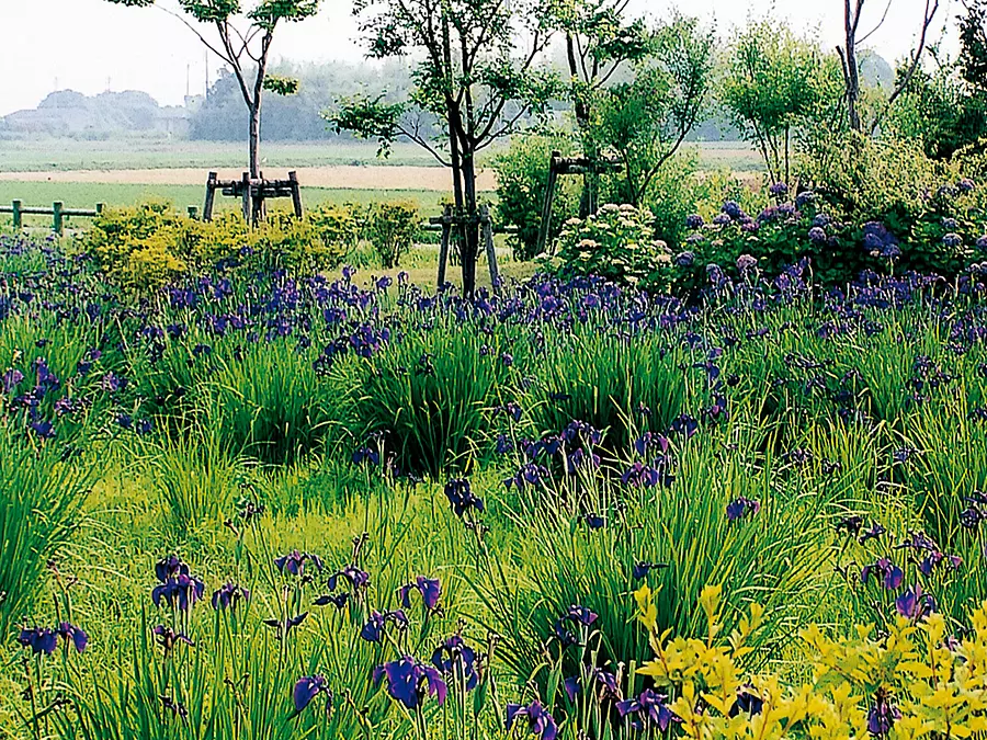 園内には遊歩道が整備されており、しょうぶの香りを楽しみながら、ゆったりとした時間を過ごすことができます。わきを流れる小川(水路)には水生植物もあり、6月下旬頃には、ホタルも観賞できます。
