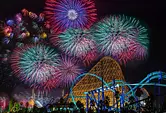ファミリーに人気の遊園地ナガシマスパーランドの花火。ナガシマスパーランドでは夏の特定日に花火を打上げ。打ち上げ花火や迫力のスターマインがみどころ。遊園地のアトラクションと一緒に楽しみたい。園内からならどこからでも楽しめる!