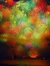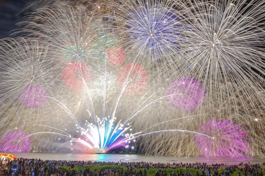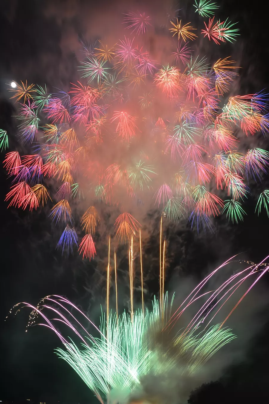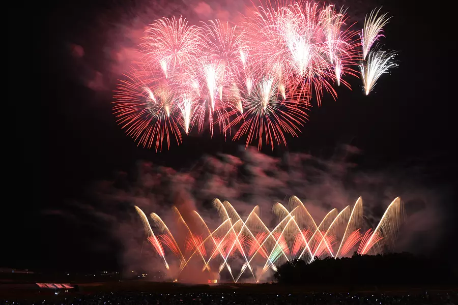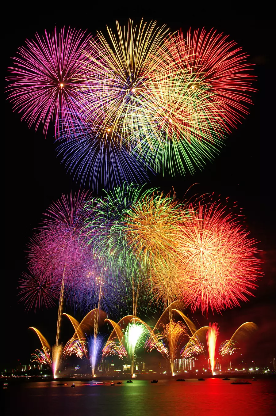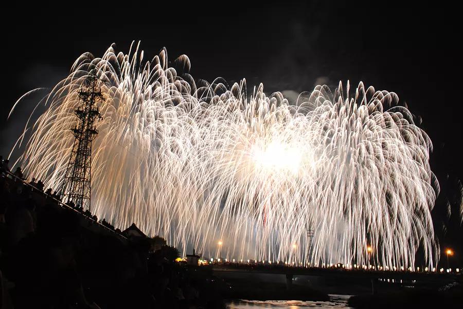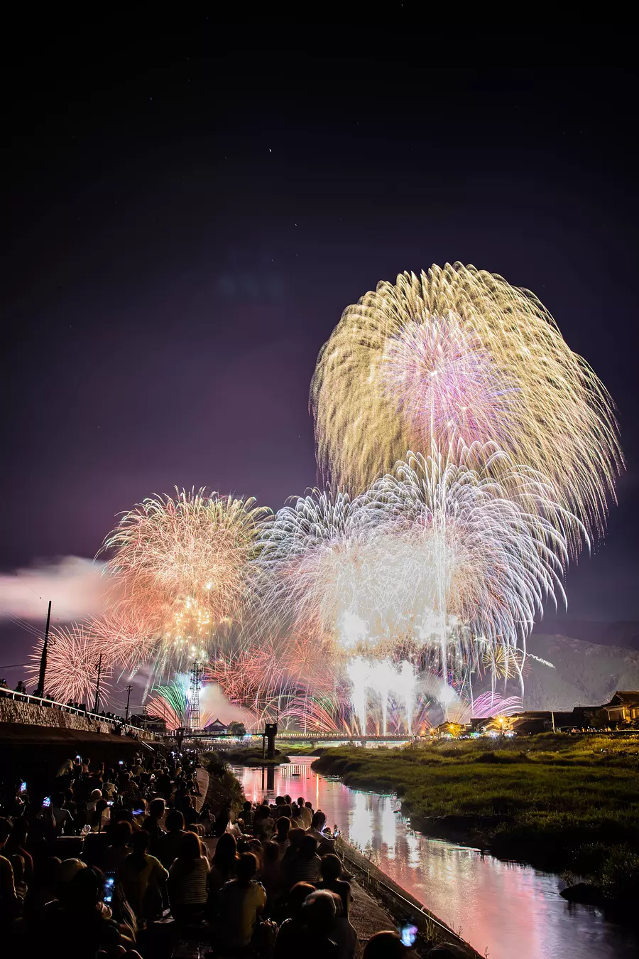 日本三大競技花火大会のひとつで、打上花火の部とスターマインの部の花火師が技と心意気を競うコンクール形式の大会です。花火師達がその年の安全を祈願し伊勢神宮に花火を奉納する意味もあり花火大会の中でも早期に開催されています。特にスターマインの部では様々な花火がリズミカルに打ち上げられ、競技大会ならではの高レベルな花火を見る事が出来ます。