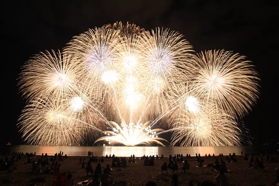 大正時代にはじまった歴史ある花火大会。虹色の配色の花火や疾走する船から繰り出される海上花火など趣向を凝らした見ごたえ抜群の演出です。砂浜から臨場感あふれる花火をお楽しみください。海岸線3kmのどこからでも観覧可能に!協賛者招待エリアを新設!