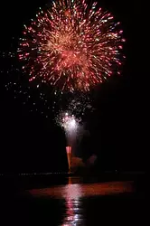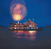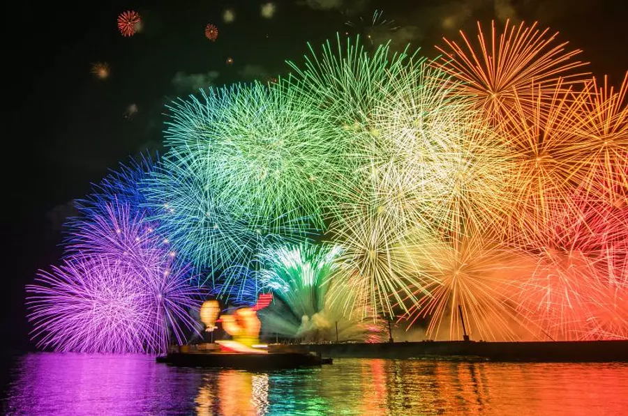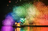 鳥羽湾の空と海を彩る海上の花火大会。花火や遊覧船の光が水面に反射して幻想的な景色が楽しめます。