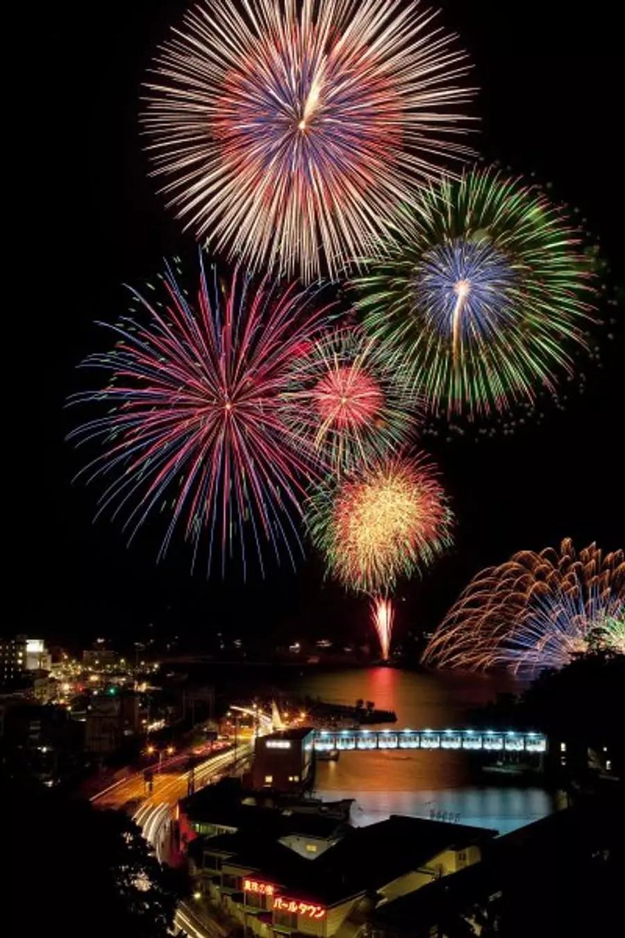 吉野熊野国立公園の鬼ヶ城を背景に、大海原に向って豪快な花火絵巻をくりひろげるもので、熊野路最大の夏の風物詩となっています。約10,000発の花火が世界遺産を美しく染めます。