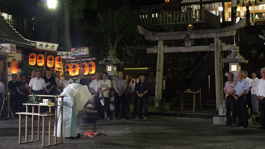 宵宮では、奉納花火が打ち上げられたあと氏子11地区から提灯を持ち寄り探湯(くがたち)神事が行われ、五穀豊穣・無病息災等が祈願されます。翌日の祇園祭には、稚児踊りと花笠神事(うちわとり)が執り行われます。