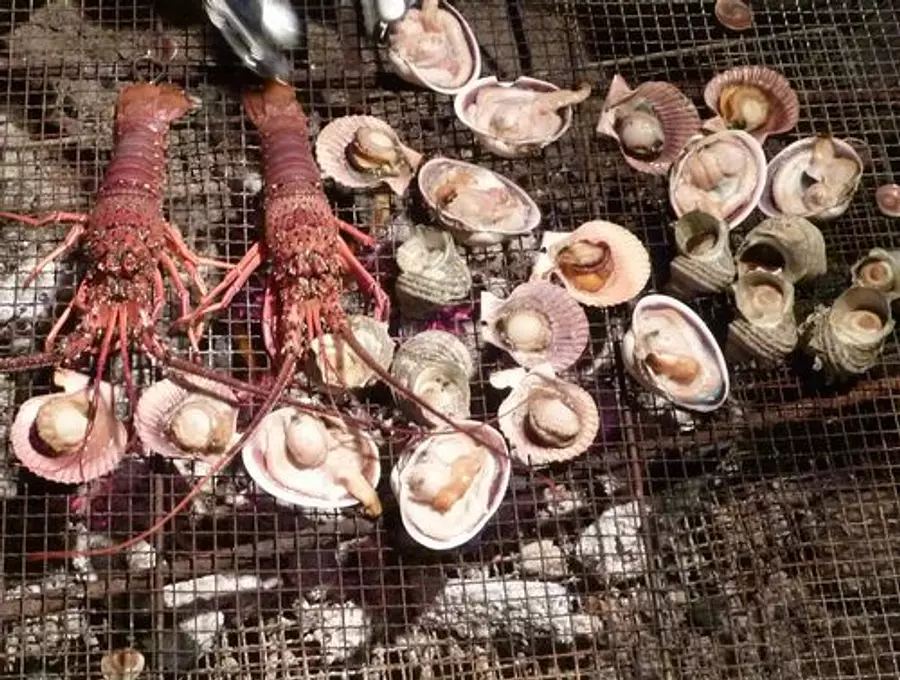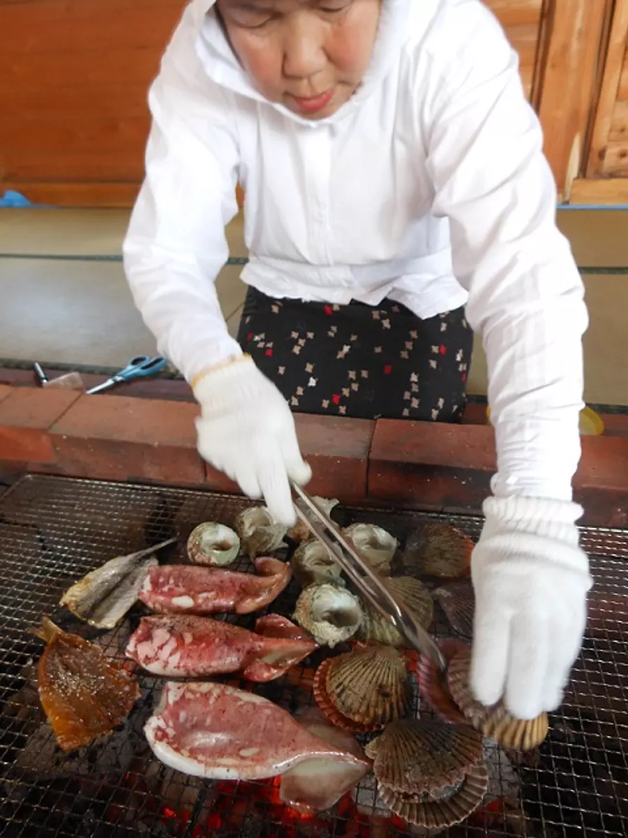 経験豊かな現役海女さんたちのパワフルで楽しいお話と炭火焼きでいただく新鮮な魚介類の美味しさをご堪能ください。