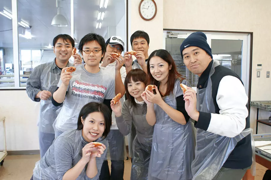伝統の技術とかまぼこの美味しさを実際に体験していただこうと、「手づくりかまぼこ体験工房」を若松屋で開催しています。刃のない包丁「つけ包丁」を使って自分だけの蒲鉾を作っていただくことができるほか、串にすり身を付け焼きたての蒲鉾も味わっていただきます。