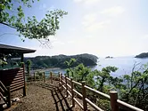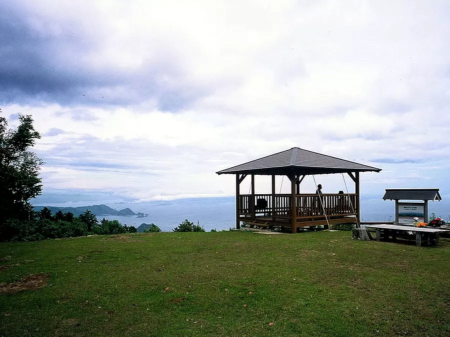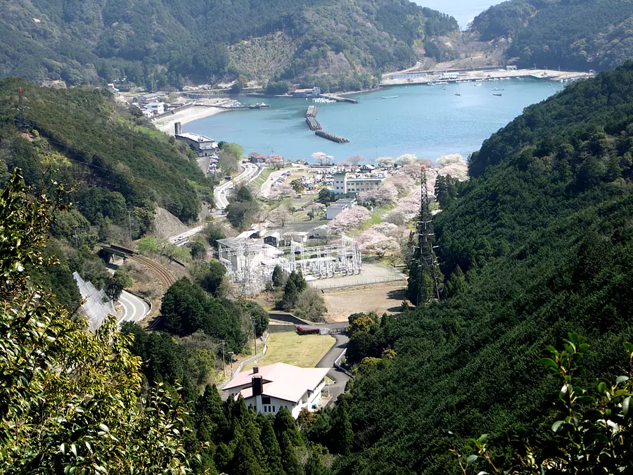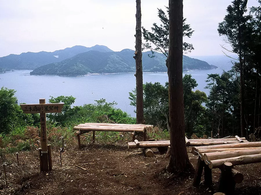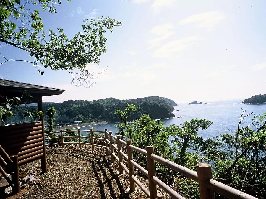 峠の展望台からは、紀伊の松島の島々が熊野灘に浮かぶ優美な景色が一望できます。登り口は宮川第二発電所の裏手で、始神さくら広場は桜の名所としても知られており、春には桜並木に彩られます。