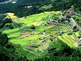 丸山千枚田は現在でも米作りが行われ、今なお時間帯や四季を通じて様々な表情を見せる美しい景観が保存されています。その千枚田を見下ろす展望台や、田圃道に突如現れる大岩など見どころも多く人気のコースとなっています。近くにはキャンプ場もありシーズンには多くの人で賑わいます。