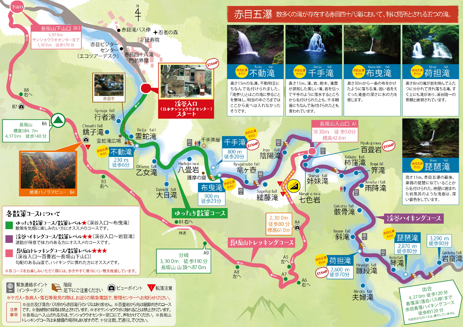 不動橋からの眺めが壮観な不動滝、岩に伝って何層にも流れる千手滝、一筋に流れ落ちる布曳滝、二つに別れて流れる荷担滝、深い蒼色の滝つぼが特長な琵琶滝など…四季ごとに移り変わる風景を目で見て、水が流れ落ちる音を耳で聞いて、たっぷりのマイナスイオンを感じて、体中リフレッシュ!