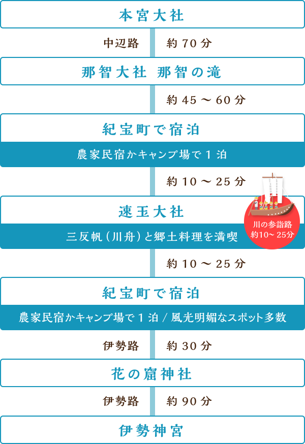 熊野古道最大級のパワースポットともいわれる「花の窟神社」へは車で約30分。そこから「伊勢神宮」までは約1時間30分。