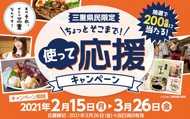 県民の皆様に身近な観光を楽しんでもらいながら 地域の魅力を再発見していただくとともに、 新型コロナウイルス感染症により、甚大な影響を受けている 県内の観光産業を支援していただくため、 三重県民限定の観光キャンペーンを実施します。