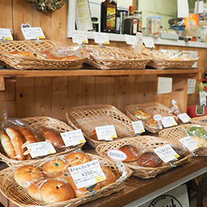 道路脇に立つ小さな看板が目印の米蔵を改装したパン屋さん。店内に並ぶ約40種類のパンは全て天然酵母を使用。カリフォルニアレーズンがたっぷりのレーズンパン(290円)のほか、音楽好きの店主ならではのビートルズにちなんだパンなどもあります。売り切れることもあるので、早めに来店することをおすすめします。