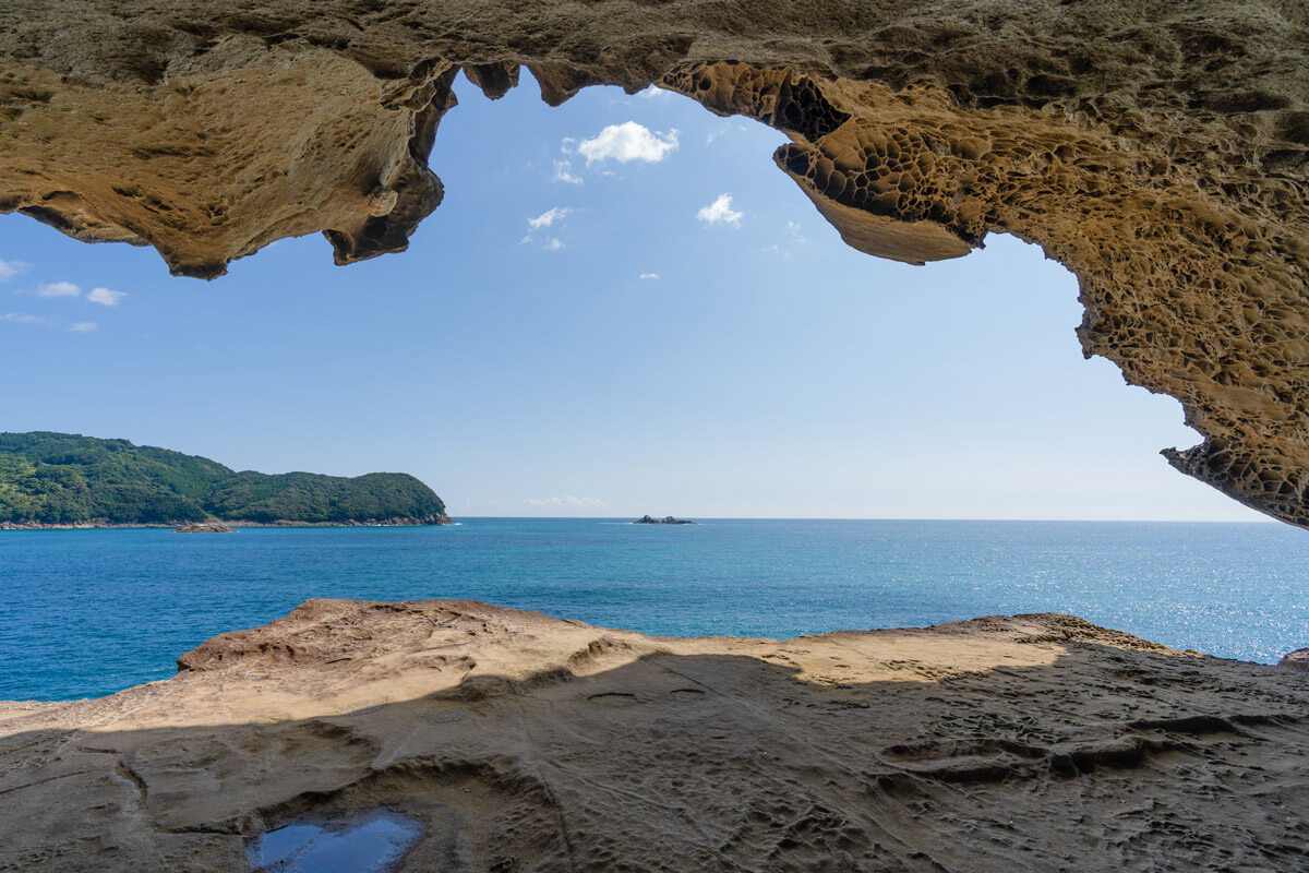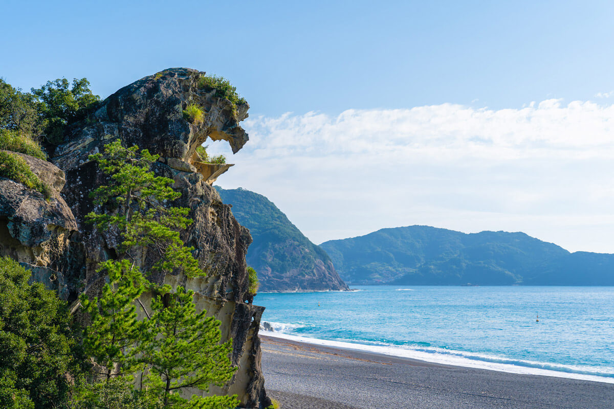熊野灘の荒波と急激な隆起によって造り出された大小無数の洞窟が、約1kmに渡り階段状に並んでいます。荒々しい風景はまさに鬼のすみかのよう。「日本百景」「新日本旅行地百選」に選ばれています。