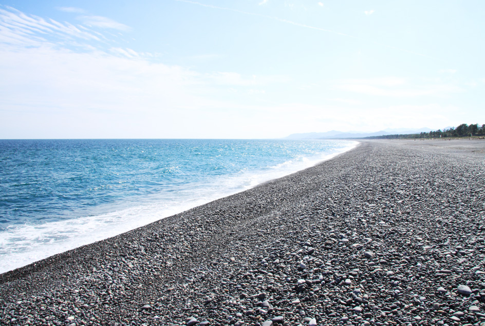 西国三十三所名所図解には旅人や巡礼者が歩く姿が描かれており、江戸時代から熊野三山へ向かう道であったことから浜街道として世界遺産に登録されました。熊野川が運び込んだ紀伊半島各地の色とりどりの石を見ることができます。砂浜ではなく、石の海岸なので、波の音にも癒されます。