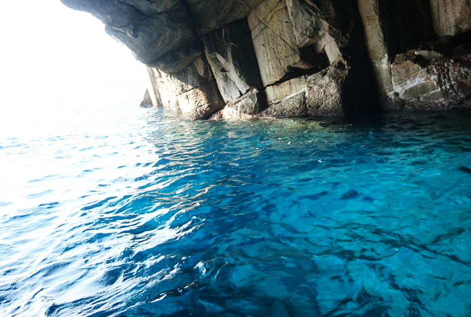 海から眺める、熊野灘の荒波に造られた壮絶なリアス式海岸の美しさ、二木島(にぎしま)湾口に聳え立つ柱状節理(ちゅうじょうせつり)、鮮やかな大岩壁「楯ヶ崎」とその背後に聳える「海金剛(うみこんごう)」の迫力は見るものを圧倒します。楯ヶ崎の「ガマの口」は熊野の「青の洞窟」と言われるほど美しく、紺碧の海が楽しめます。