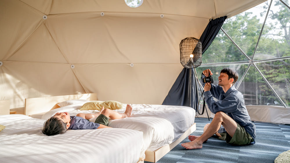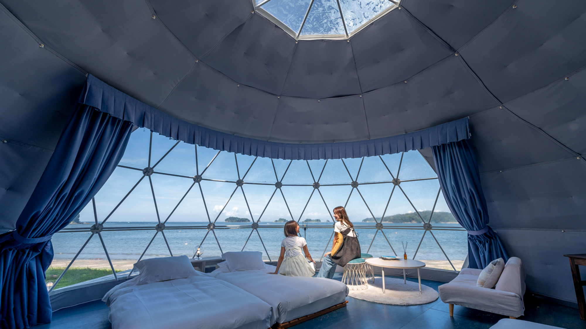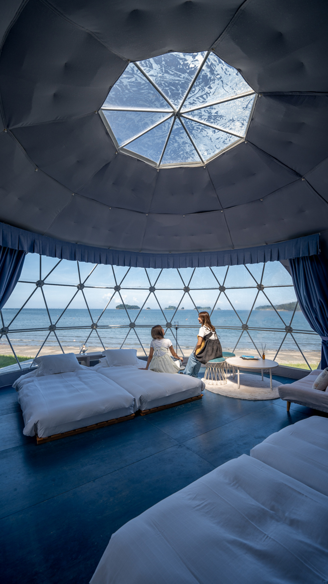 プライベートビーチに面して立つドーム型テントでシーサイドグランピングを満喫。ドーム内部はホテルのように快適でラグジュアリーなしつらえ。遠浅で穏やかな海は波音も心地よく、伊勢志摩国立公園の豊かな自然に囲まれながら、癒しのひと時を過ごすことが出来る。