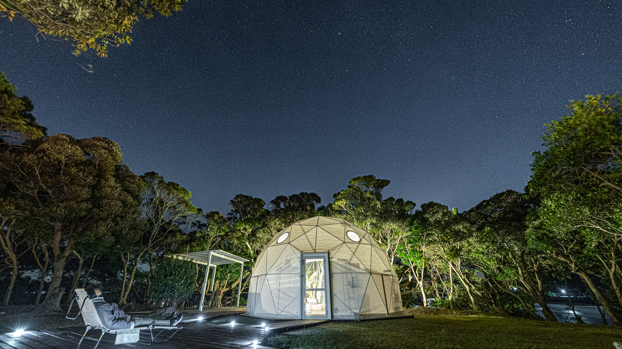 志摩半島の最西端に位置し、御座白浜海水浴場に隣接。最大12名で泊まれる広々としたドーム型テントや、夏は通気性がよく冬は保温性が高いオーガニックグリーンコットン100%のラグジュアリーテントで、大自然を間近に感じながら優雅な宿泊体験を楽しめる。