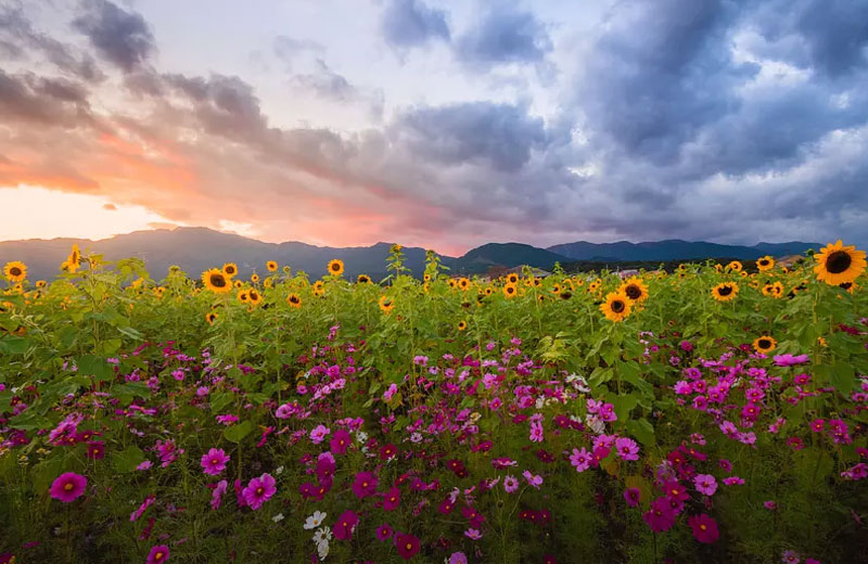 湯の山温泉や御在所ロープウエイで有名な菰野町では、広大な休耕田にコスモスを植えていて、田畑を守りつつ、秋には美しく咲き誇っています。