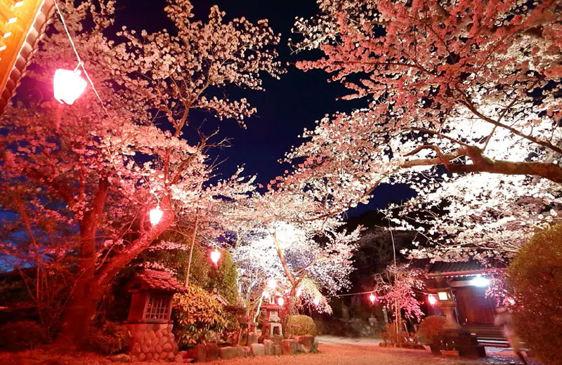 桜と伝説の名刹として知られています。春には境内いっぱいに桜が咲き乱れ、夜は灯りに照らされて幻想的な光景に変わります。