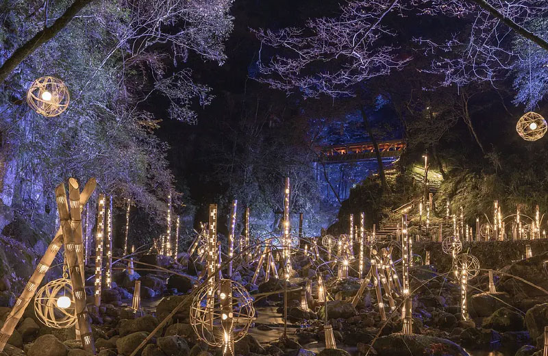 赤目四十八滝といえば、日本の滝百選、森林浴の森百選に選出されるほどの貴重なスポットです。毎年秋から冬にかけて 「幽玄の竹あかり」 が開催されています。