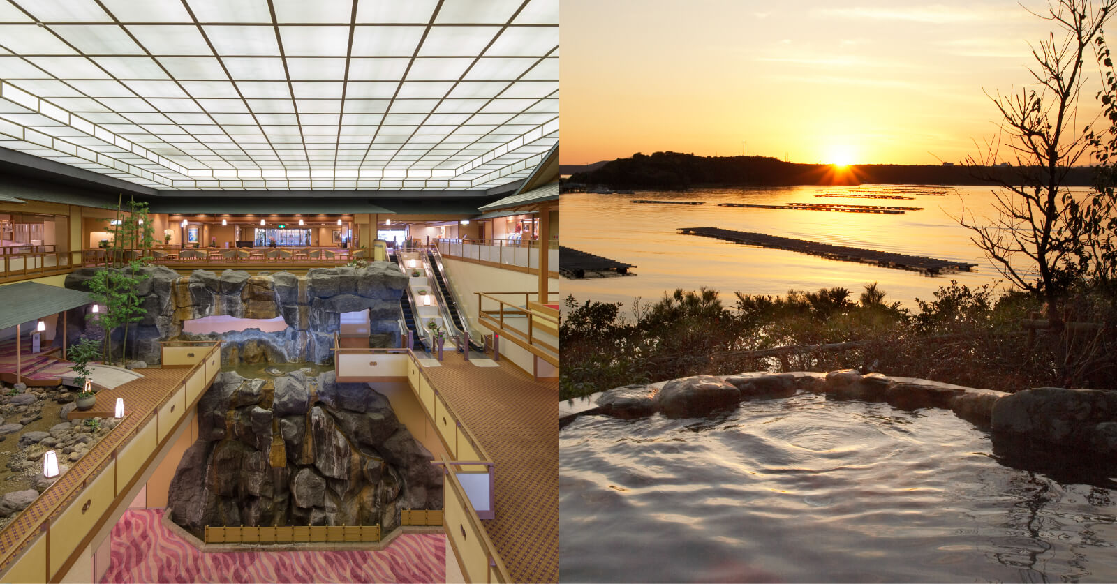 宿自慢の風流な露天風呂が楽しめる戸田家温泉村での入浴や、海を臨む回転展望レストランで鳥羽の旬の料理をお楽しみください!