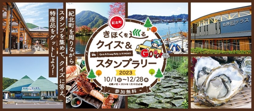 さらに、紀北町内の店舗・観光施設に貼ってあるクイズに挑戦いただき、答えを記入いただくと、正解者の中からスタンプ3つ+正解1つで5000円相当の、スタンプ3つ+正解2つで10000円相当の紀北町特産品が、抽選で当たります。