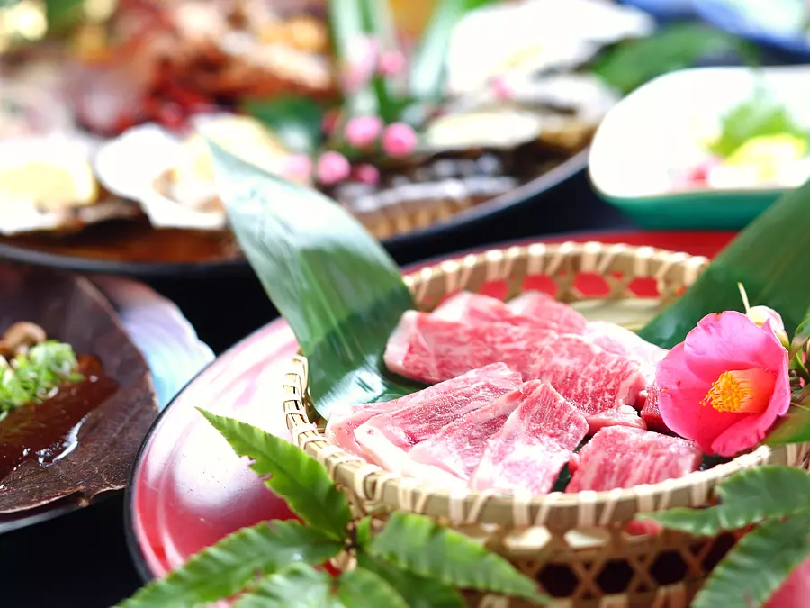 三重ブランド「伊賀牛」をはじめとした伊賀の旬を用いた月替わりの会席料理。堀りこたつの食事処囲炉裏茶屋「ごえもん亭」で、伊賀牛や山海の幸を焼いてお召し上がりいただく名物の「あみ焼き料理」に下鼓を。