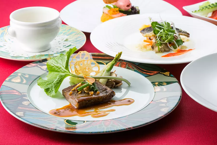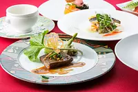 ディナーは併設の「レストラン アンジュ」にて、地元の食材をていねいに調理したフレンチフルコースをお召し上がりいただけます。