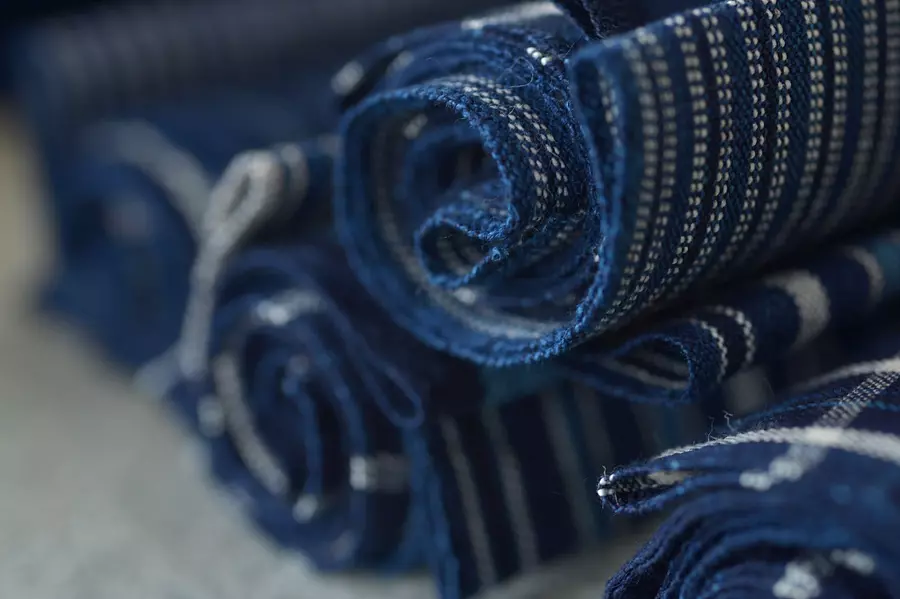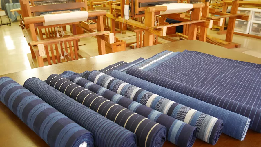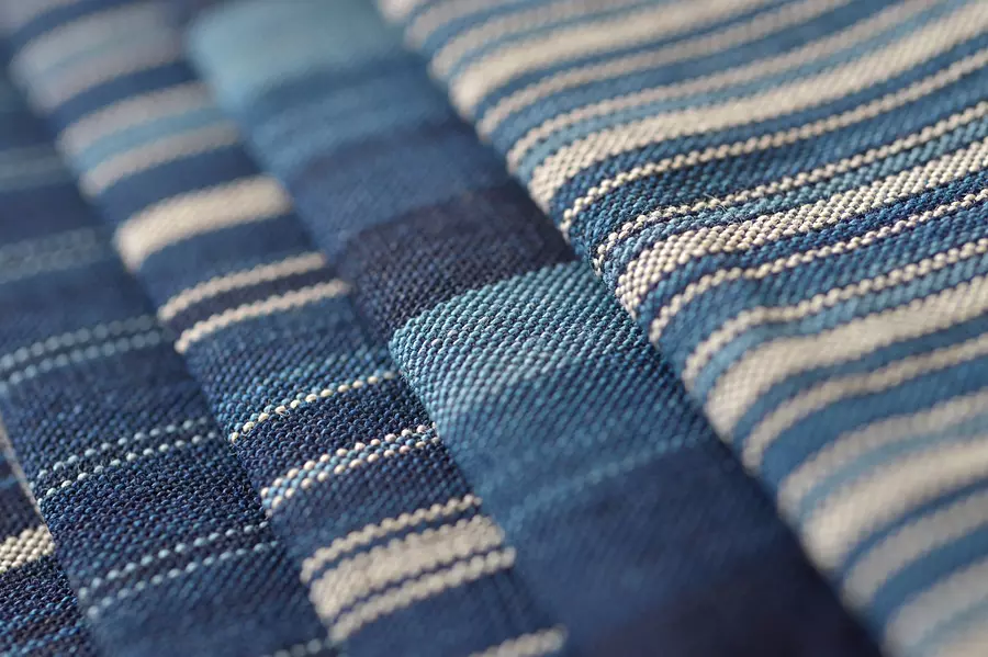 正あい染めの糸を使い、縞模様が特色。素朴な風合いです。反物はもちろん、ネクタイ・財布・コースター等の小物などに人気があります。