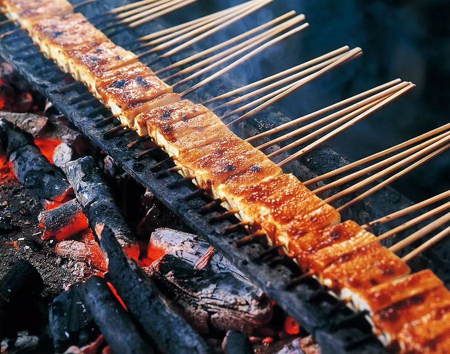 とうふ田楽は伊賀自慢の味覚のひとつ。昔は海の幸が手には入りにくかったため、貴重なタンパク源として重宝されていました。伊賀地方では、お正月や花見など人が多く集まる時のご馳走として、自家製の味噌を玉のように丸めて吊るし熟成させた「玉味噌」を豆腐に塗って炭火で香ばしく炙った豆腐田楽をふるまっていました。