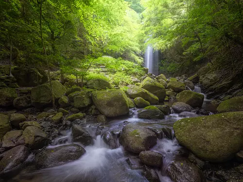 近くには不動明王が祀られ、夏には涼を求める人々、秋には紅葉を楽しむ人々で賑わいます。滝までは石段になりますので、歩きやすい靴がおすすめです。