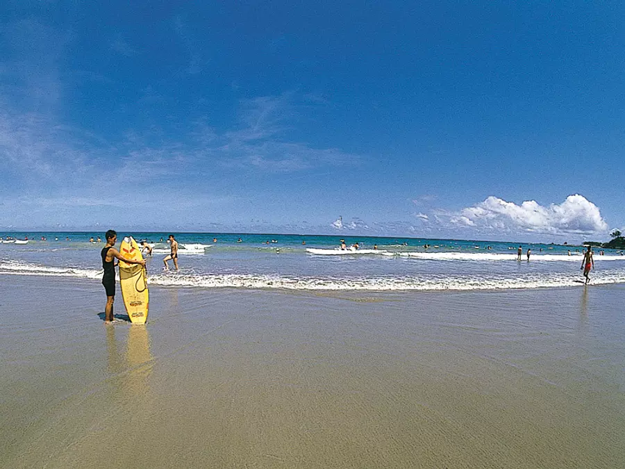 白い砂浜が続く遠浅の海岸。サーファーたちに人気のスポットです。
