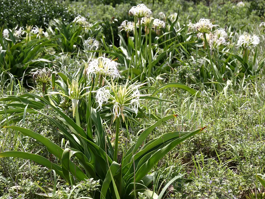夏になると、白いハマユウの群生が太平洋から吹いてくる風に涼しげに揺れます。その間には町の花オニユリのオレンジ色がチラチラと見え隠れをし、青い海をバックに美しいコントラストを見せます。