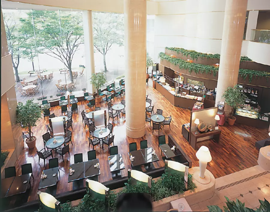 吹き抜けで陽光差し込む開放感あふれるレストラン。