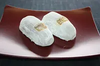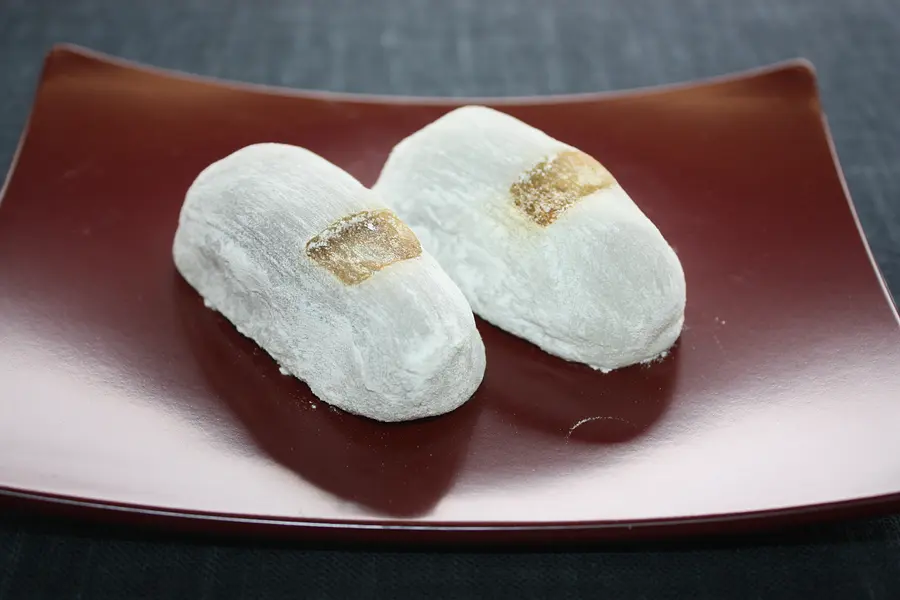 7月最終土日曜日に行われる植木神社祇園まつりのころだけに作られるあんいりもち。最近、年中定番として「よもぎ版」が誕生し、こちらは通年販売されている。