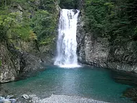 落差20mあまり、水量豊かで巨大な滝壷は水深も深く、滝食のすさまじさを物語ります。