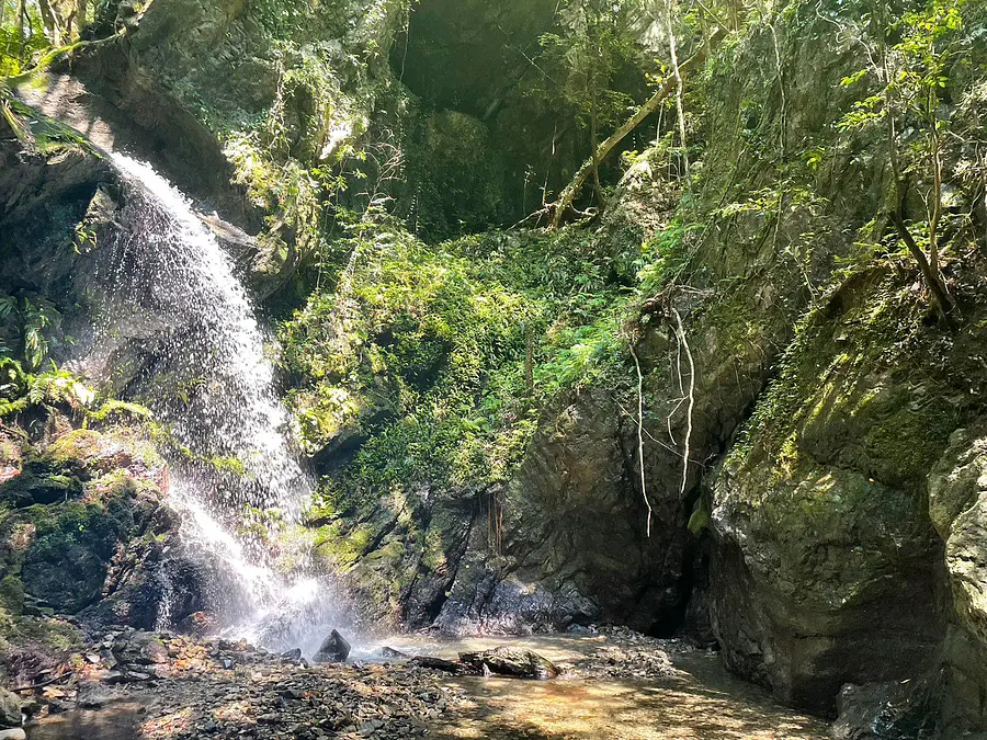 岩肌を伝うのではなく、勢いよく飛び出す水流は迫力があり、滝つぼ周辺を大岩が囲う雰囲気など、まさに秘境といえます。