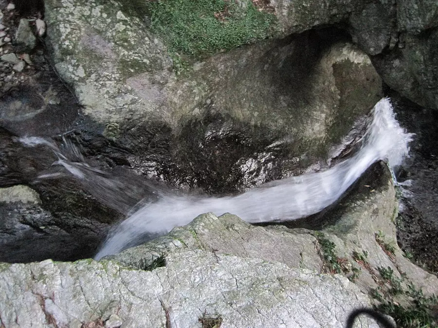 滝の上部が、長い年月をかけて流れが岩に水の道をつくり、まるでプールのすべり台のように見える河内不動の滝。