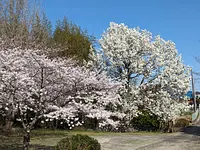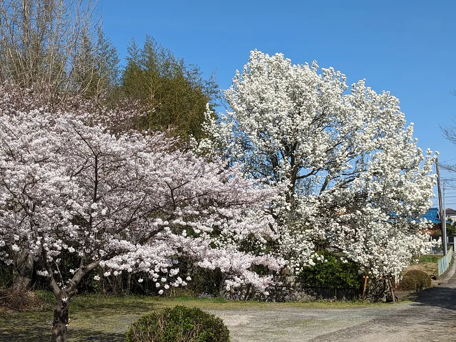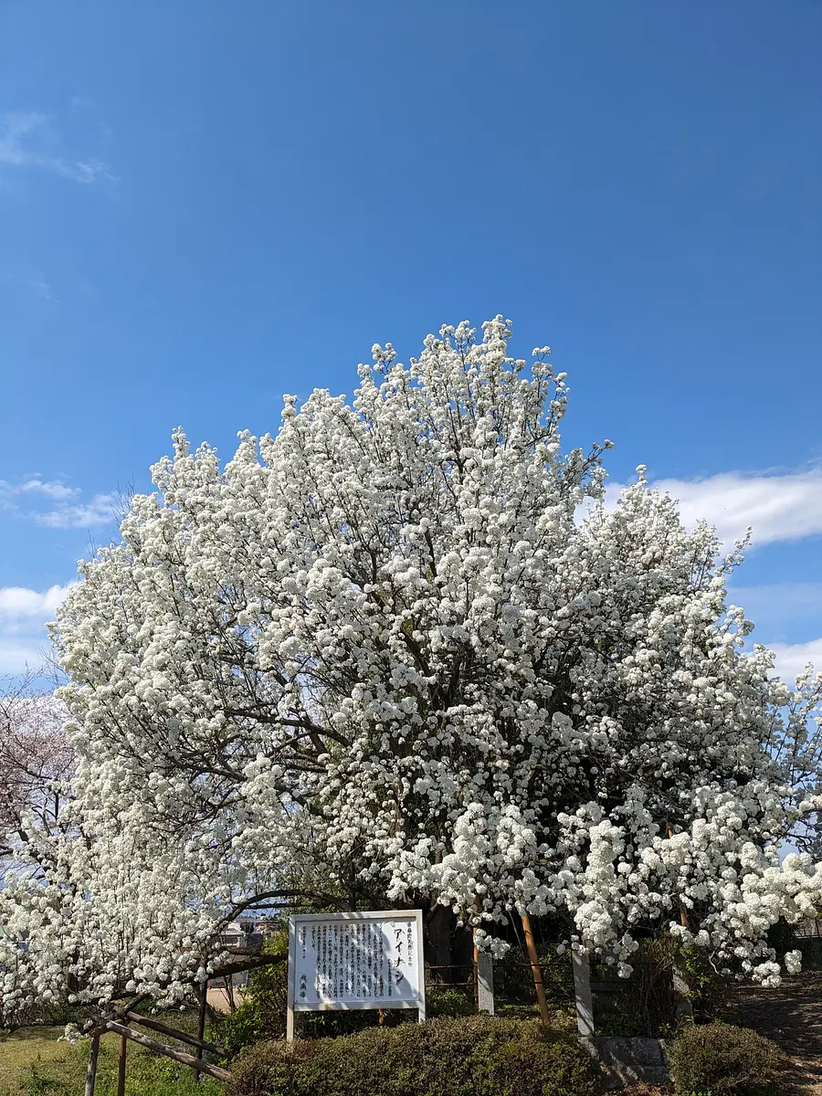 真ん中から太い木株が何本も株別れして、春には真っ白の花が重なり合いながら咲き乱れます。