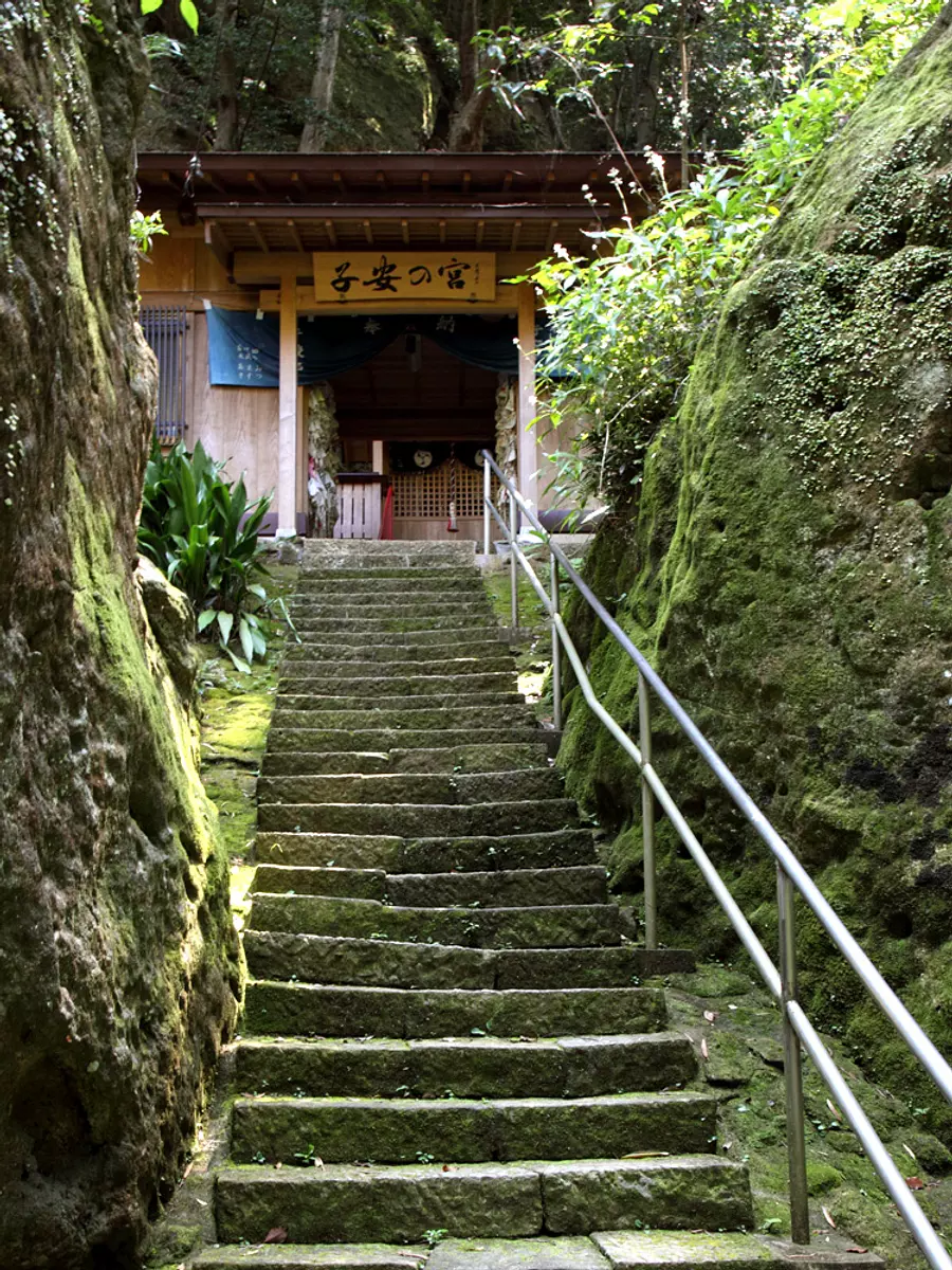 約7ヘクタールの神社の境内は、石の鳥居をくぐるとすぐに、安産樹とも呼ばれているホルトノキの巨木があり、根元に岩を板根で巻き込んで、それが子供を膝に抱いているように見えることからも神木とされています。