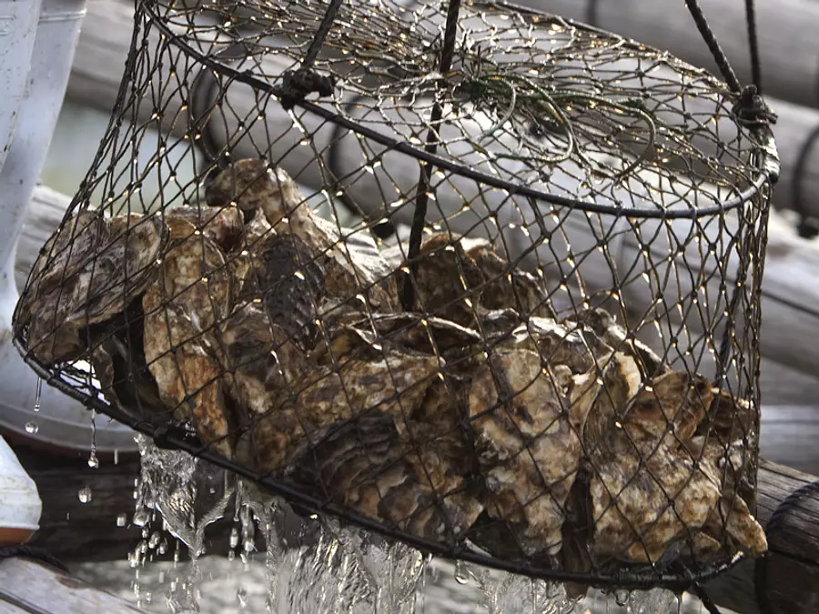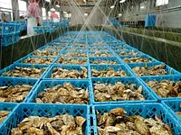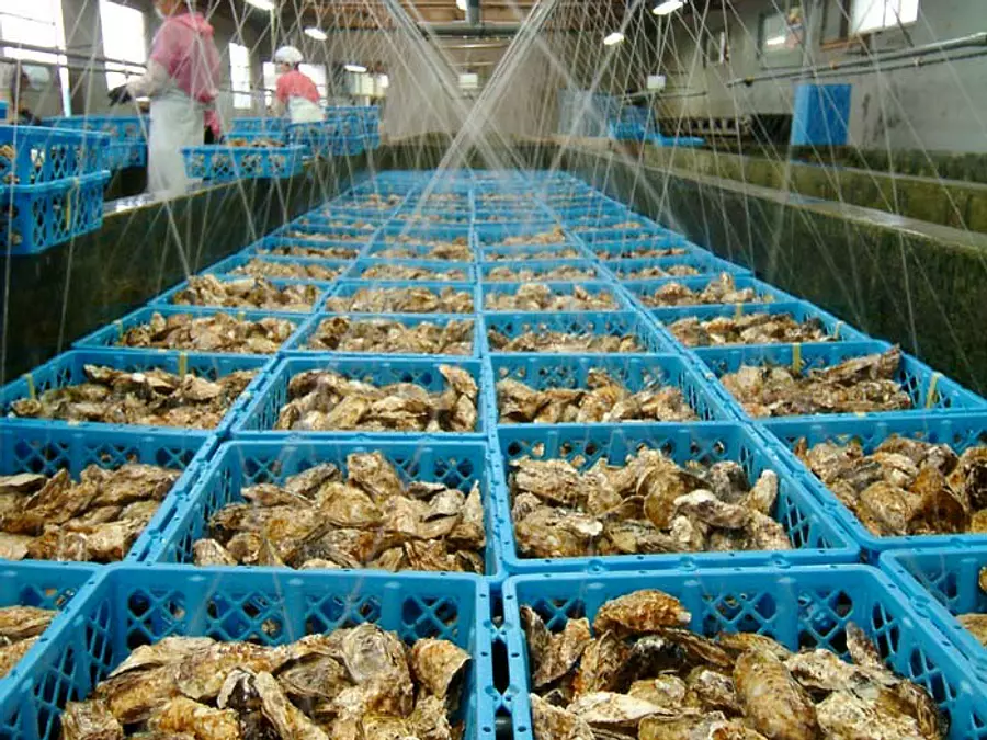 また、垂下しているカキを出荷の1ヶ月ほど前に一度海から引き上げ、一粒づつ籠に入れて再び約1ヶ月養成するため、身入りがよく、むらのないカキとなります。