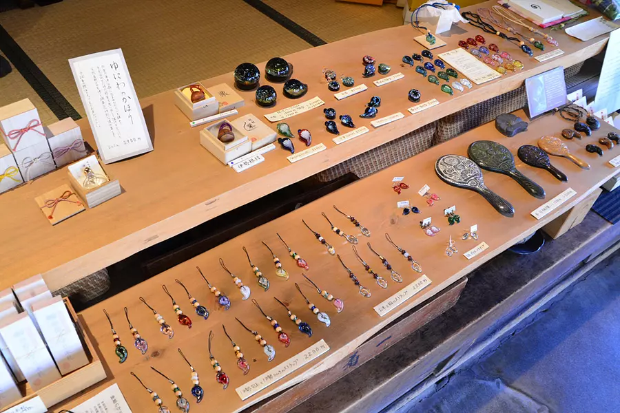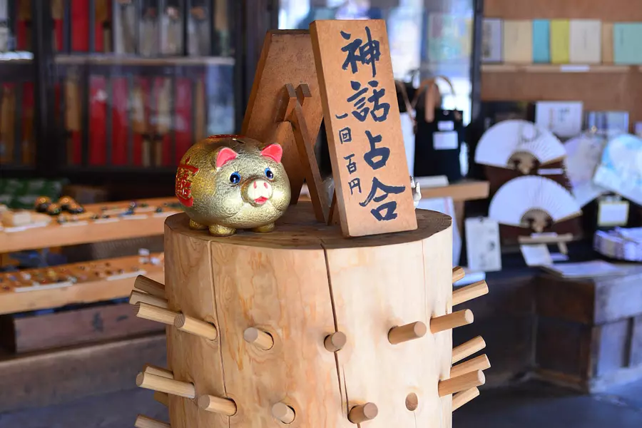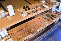 明治時代から続く、由緒ある刃物店。包丁、鋏、爪切りなど職人の技術が光る生活雑貨をはじめ、色合いが美しい「伊勢勾玉」のストラップやペンダント、外宮参拝時の空気感をイメージしたアロマ「清め香 ゆにわのかほり」など、日本文化を伝承する品々が並びます。ヒノキの切り株に刺さった43の矢から1つを引き抜き、神話からメッセージを得られる「神話占合」も人気です。