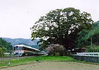 神坂の南、前村の道路沿に樹齢およそ600年といわれる大きいクスノキが天をついています。